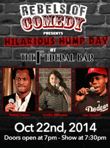 Rebels of Comedy presents Hilarious Hump Days at the Federal Bar in North Hollywood. Come out and see a night of live comedy, featuring an awesome lineup of professional features and headliner comedians. Hosted by Teddy Tutson with the show's headliners : Emilia Barrosse, Jon Durnell