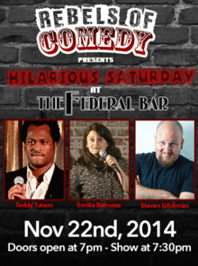 Rebels of Comedy presents Hilarious Hump Days at the Federal Bar in North Hollywood. Come out and see a night of live comedy, featuring an awesome lineup of professional features and headliner comedians. Hosted by Teddy Tutson with the show's headliners : Emilia Barrosse, Steven Glickman